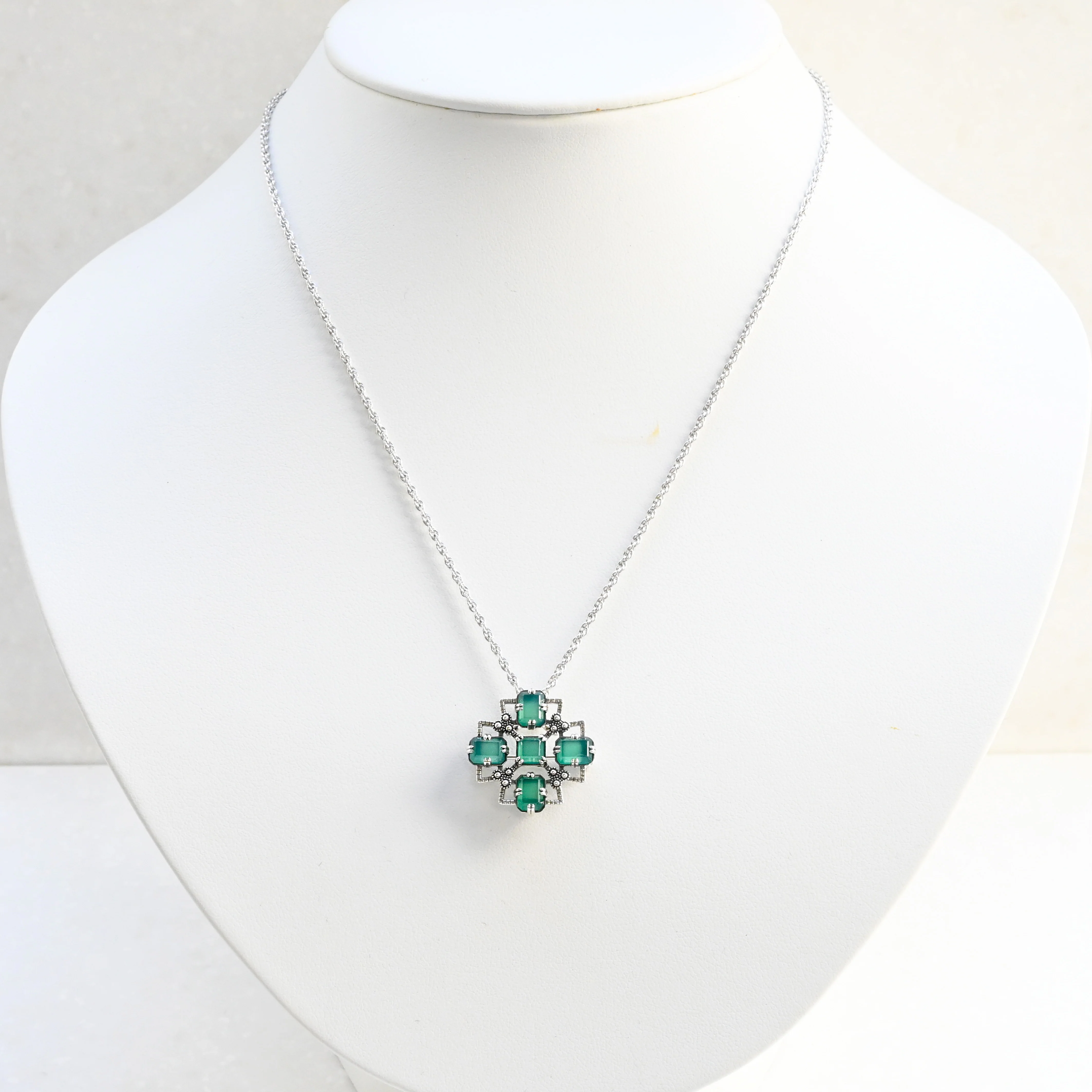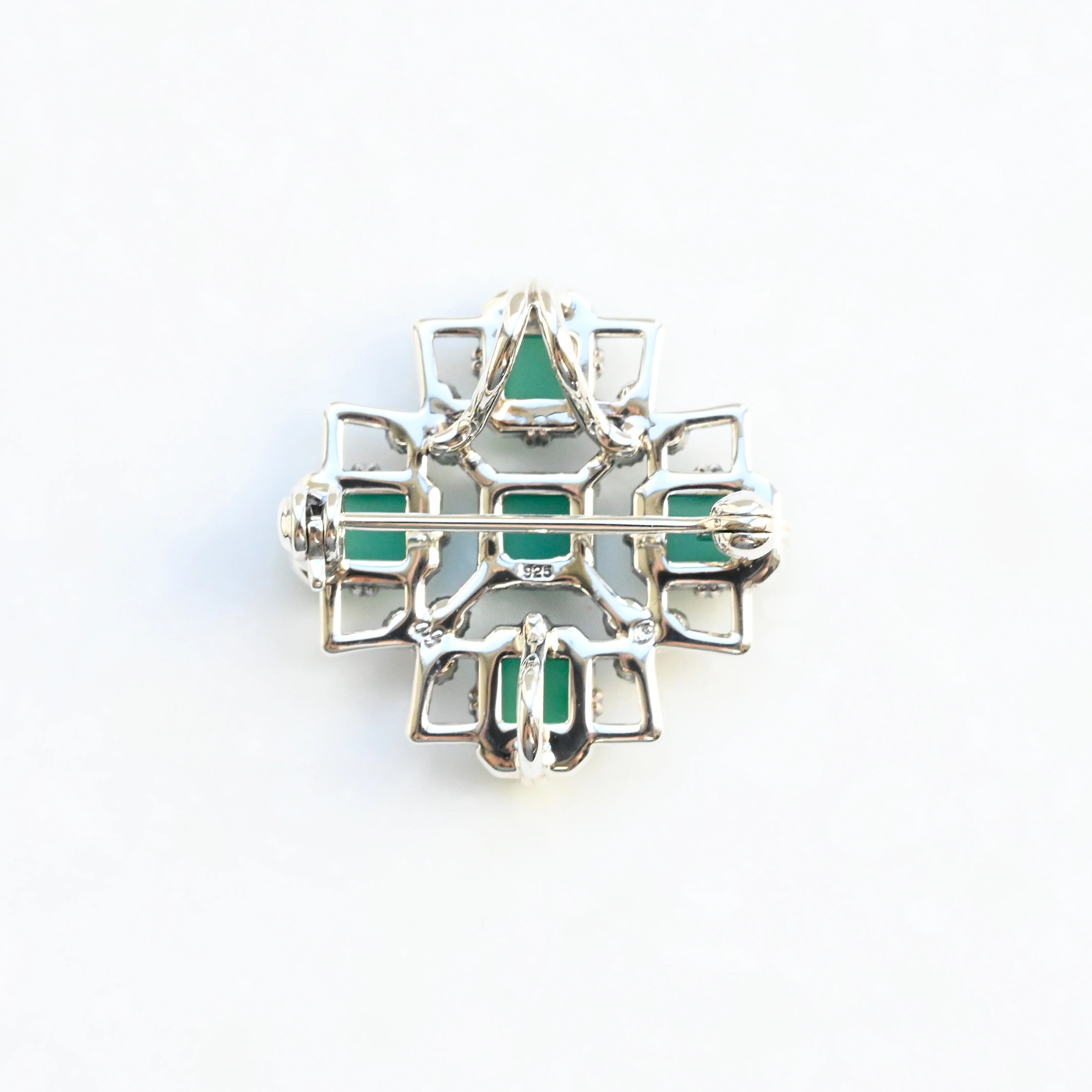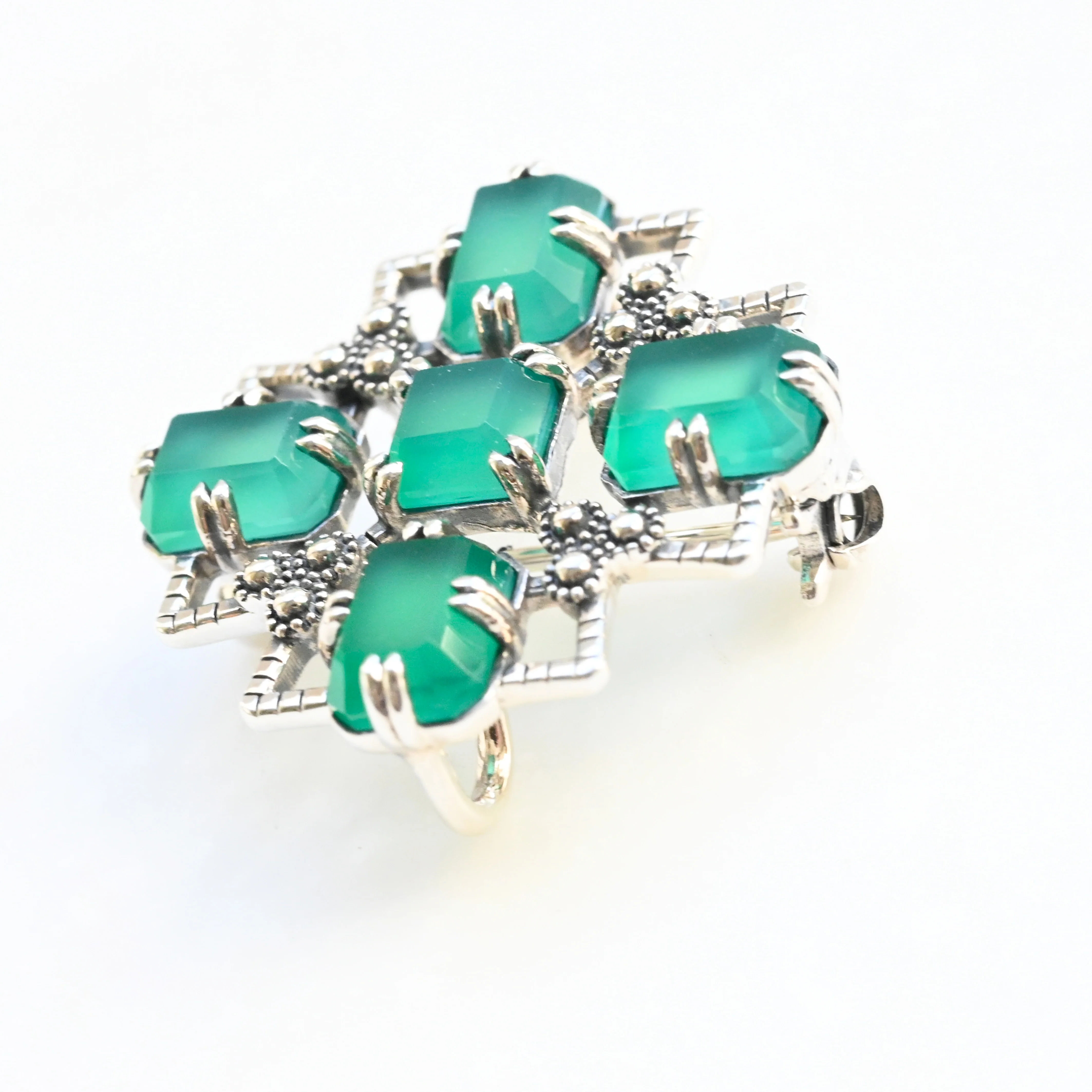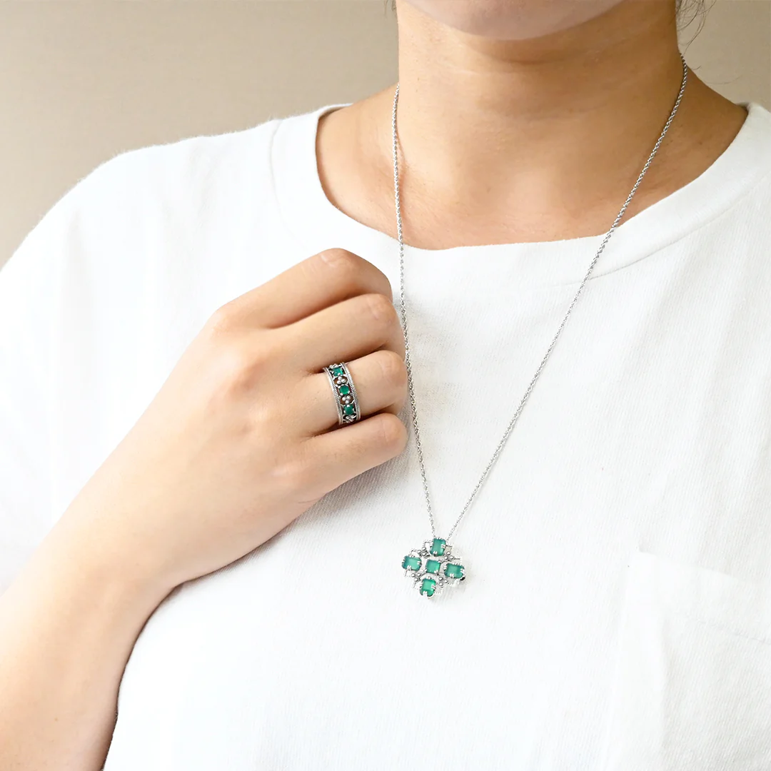 深みのあるグリーンアゲートを、シルバー925の上品な輝きで包み込んだクラシカルなブローチペンダント。