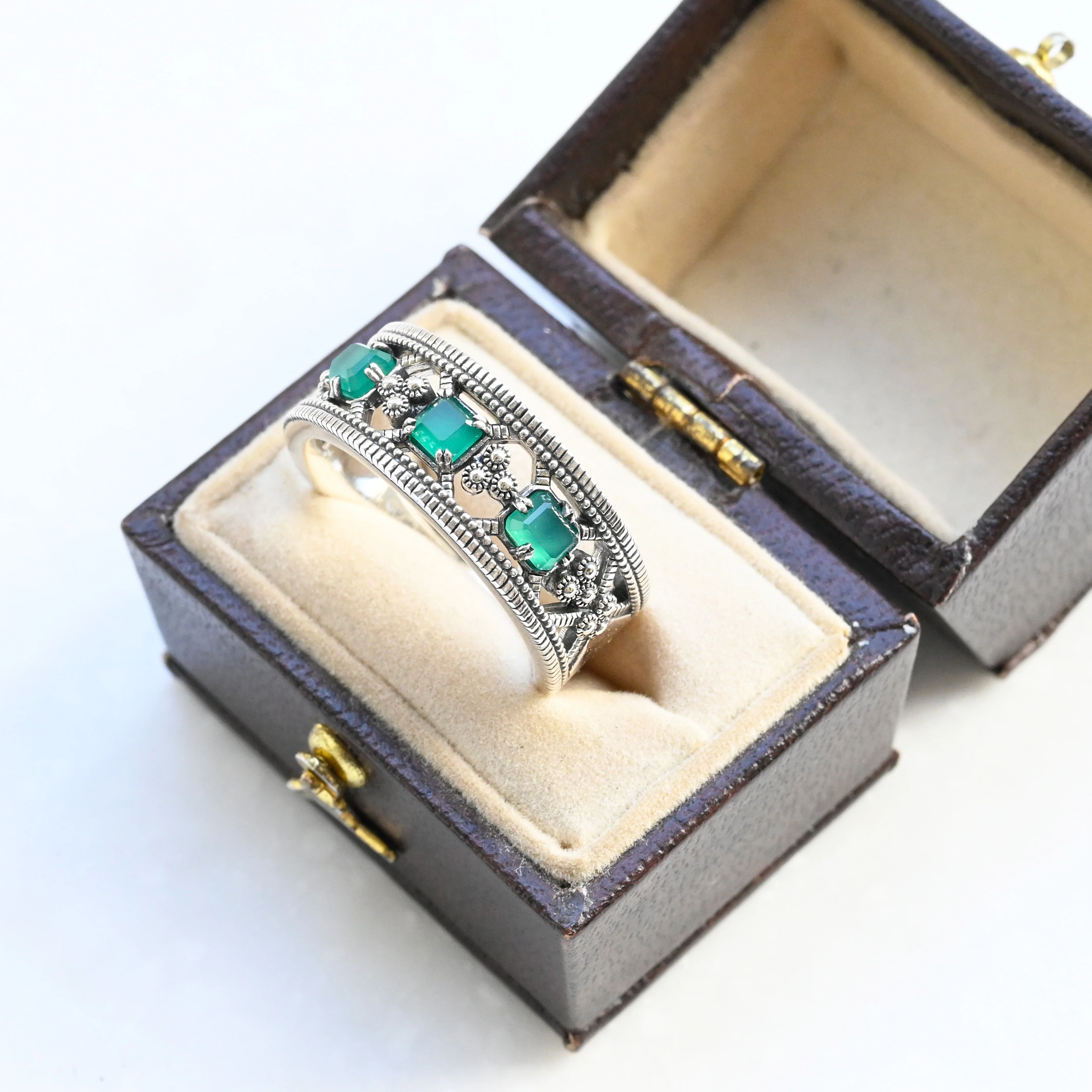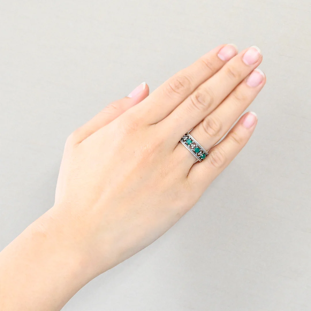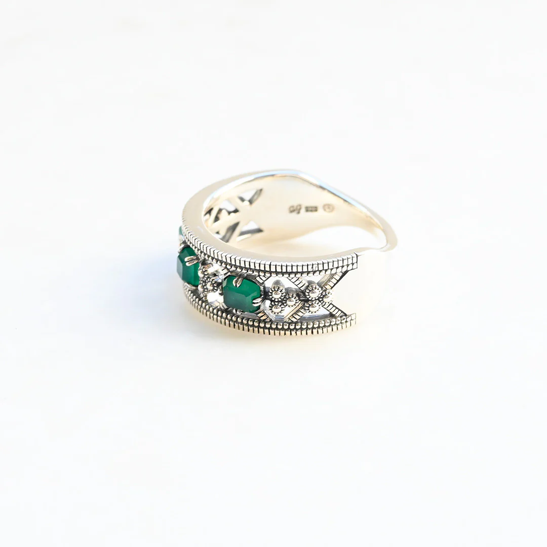 中央に深みのあるグリーンアゲートを配し、両サイドにも同じ石をセッティングすることで、バランスのとれた上品なラインを描き出しています。