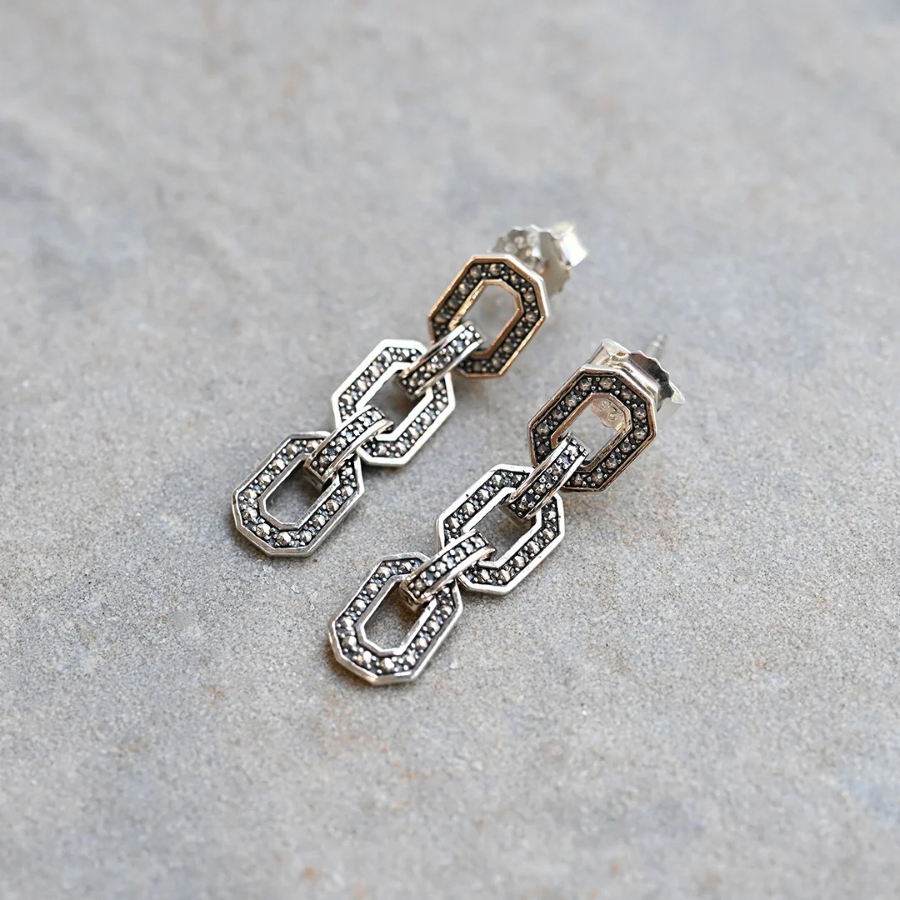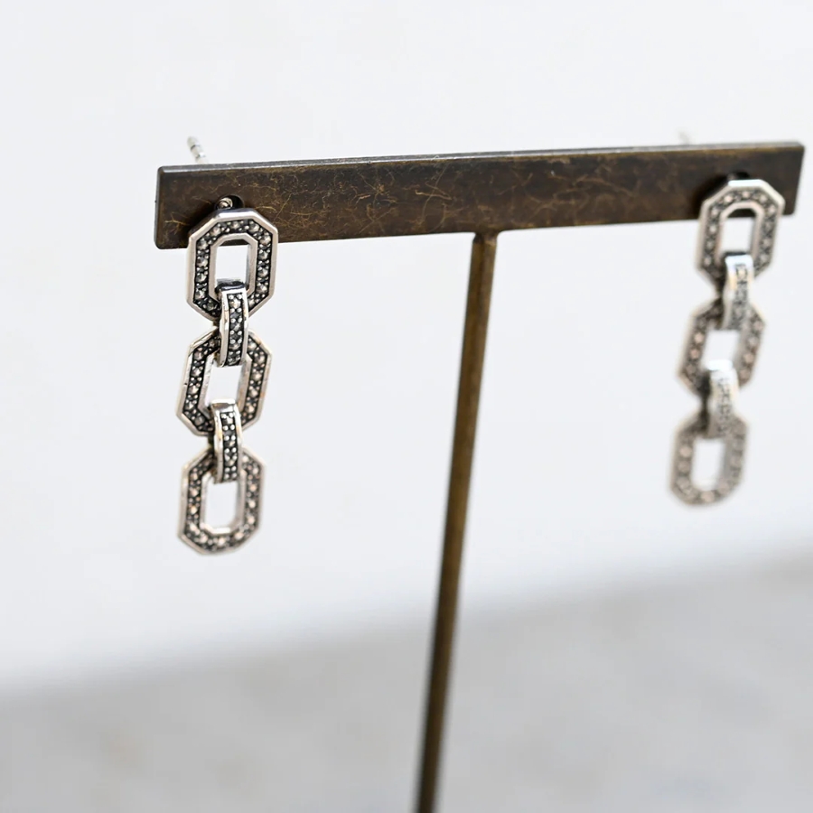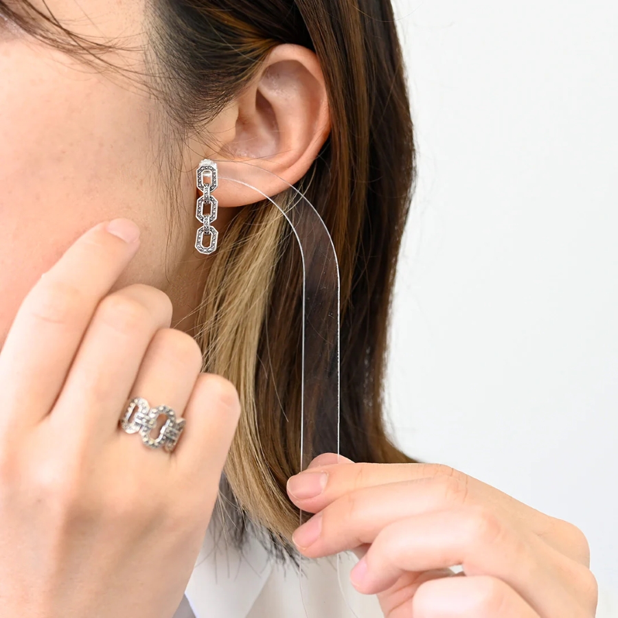 チェーンを思わせる幾何学的なモチーフが連なり、アールデコ調ならではの気品と存在感を耳元に。