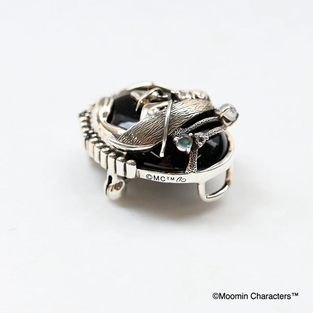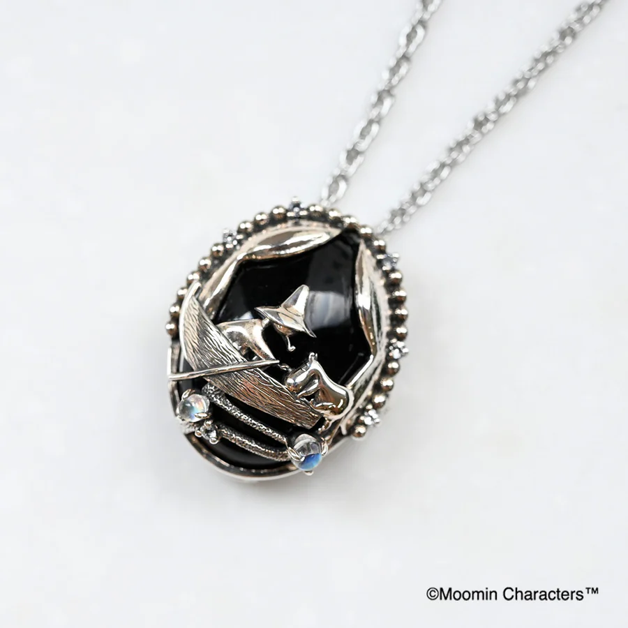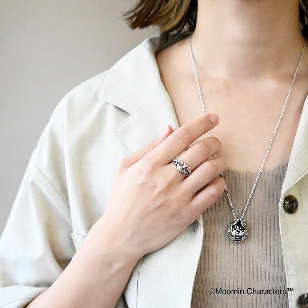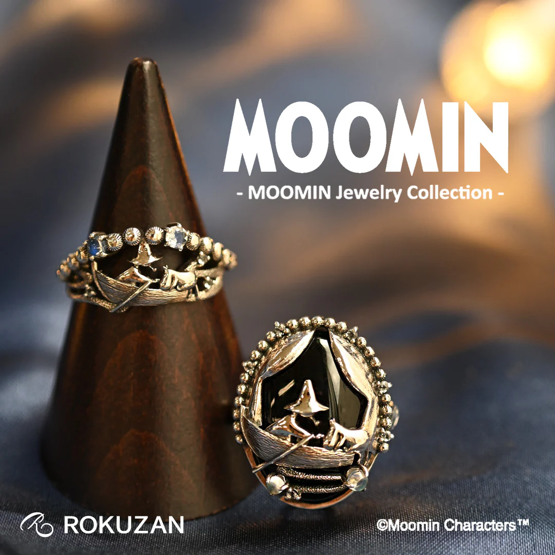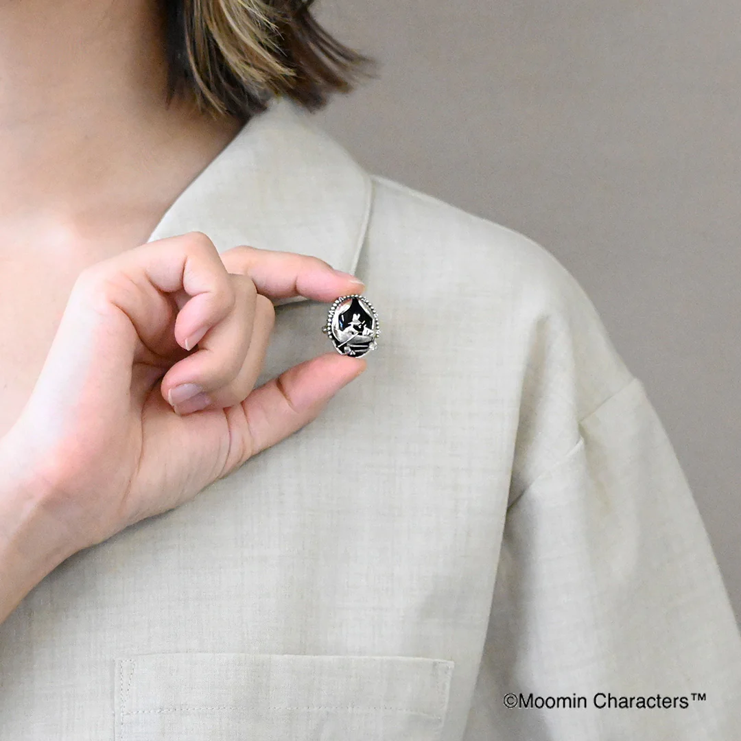 そこへ助けにきたスナフキンのボートによじ登るムーミンを描いたシックかつかわいらしいデザインのブローチペンダントとリングです。