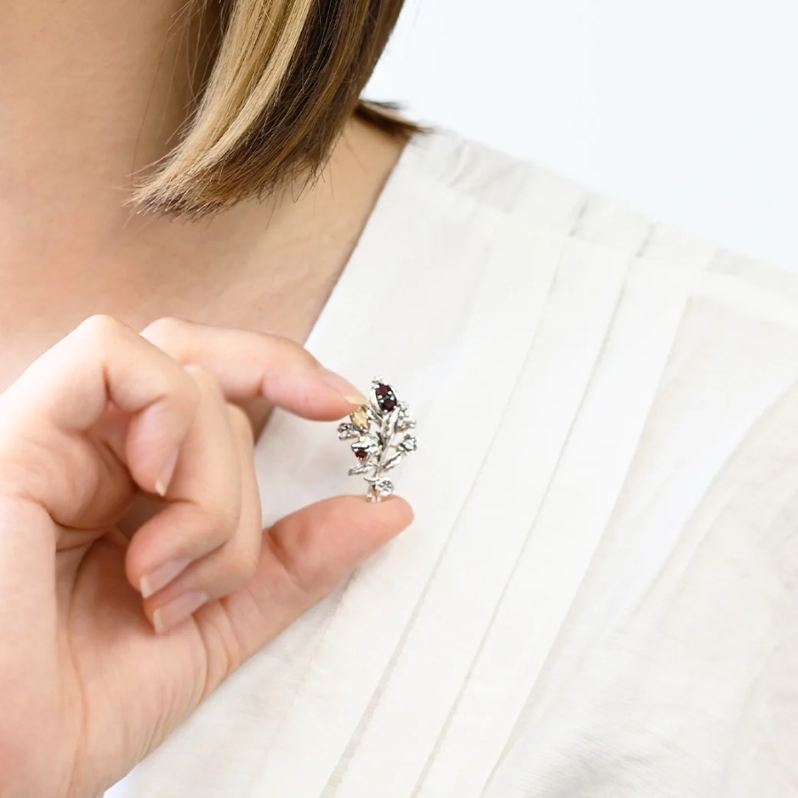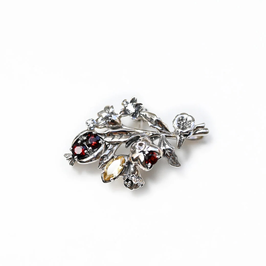 柘榴はガーネット、レモンはマーキスカットのシトリンで表現し、赤と黄色の色合いが華やかに輝きます。