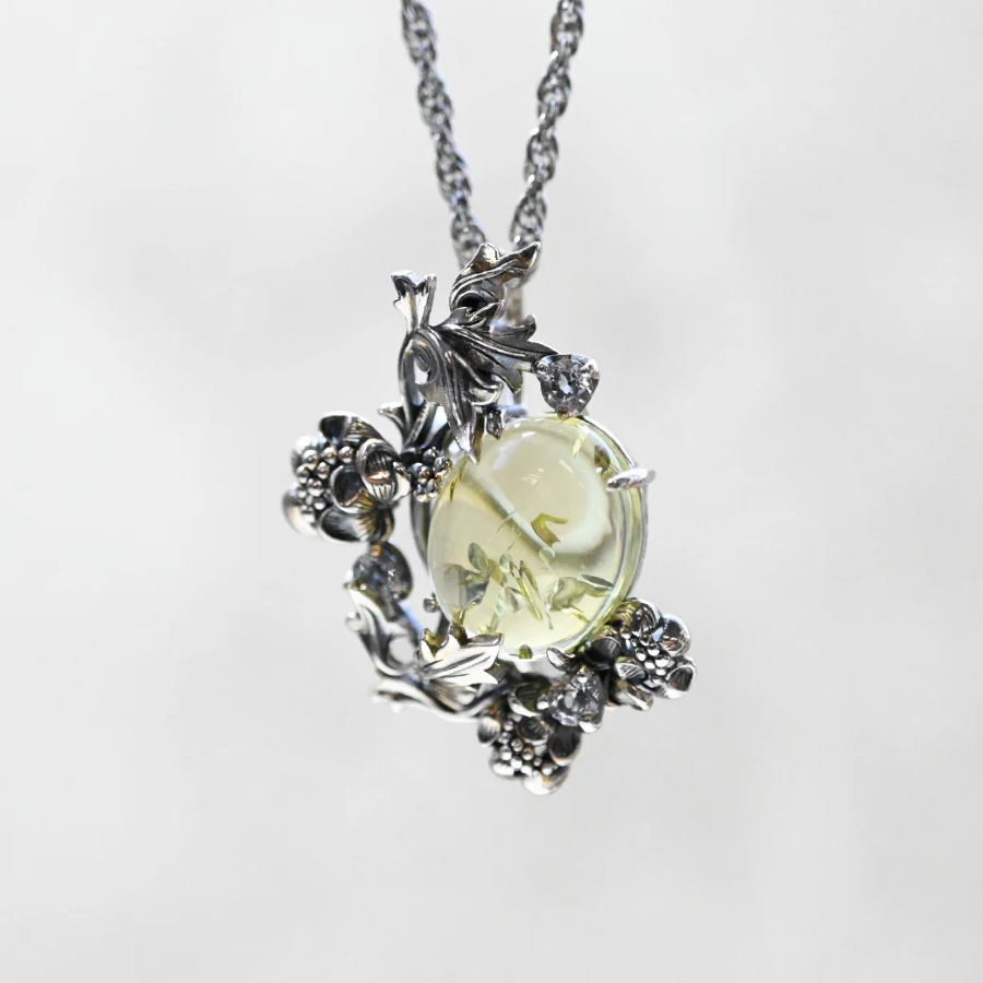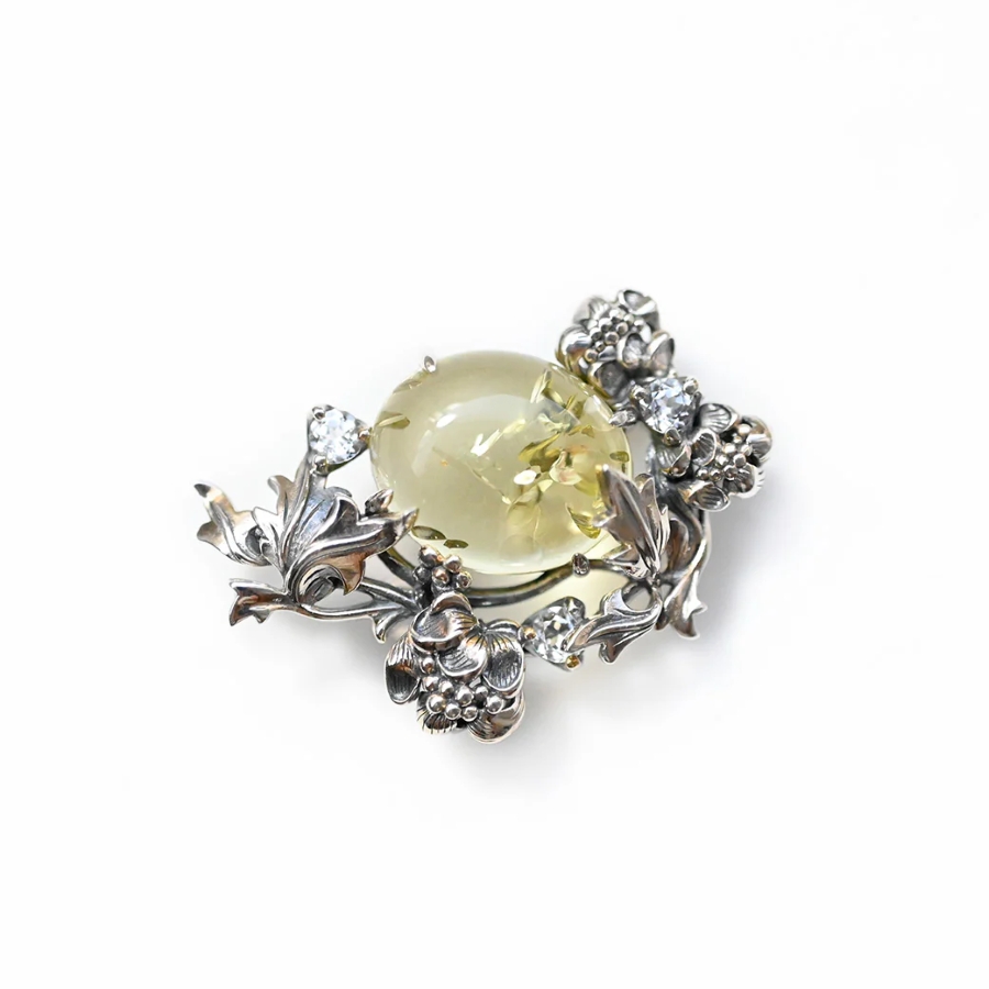 古来より護符とされたコハクは財運や人気運を高めるとされ、アシンメトリーに飾られた花模様が動きを感じさせます。