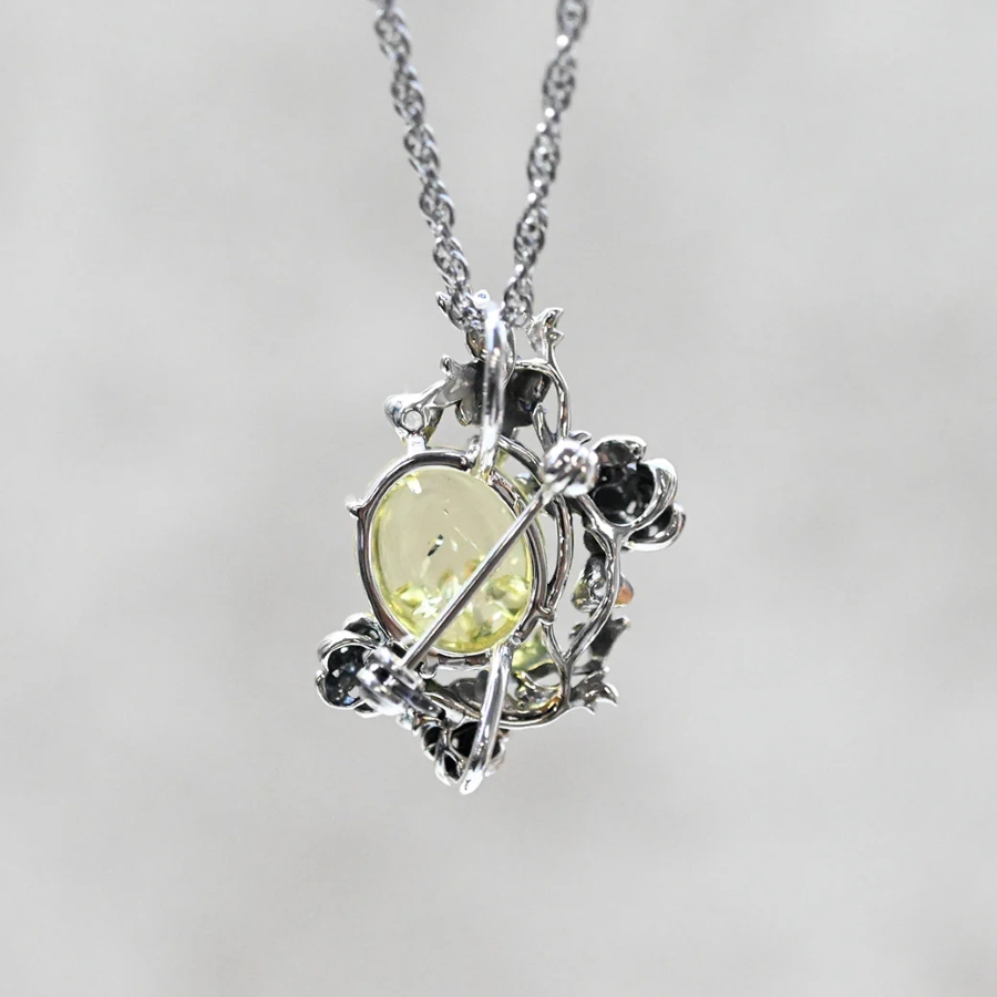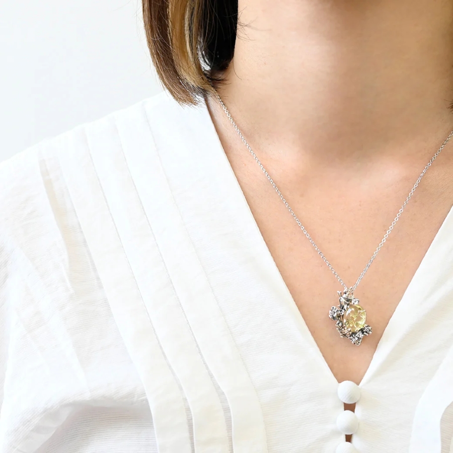 そのモチーフを取り入れたリングは、レモンカラーのコハクとホワイトトパーズを組み合わせ、透明感ある輝きがエレガントな印象を与えます。