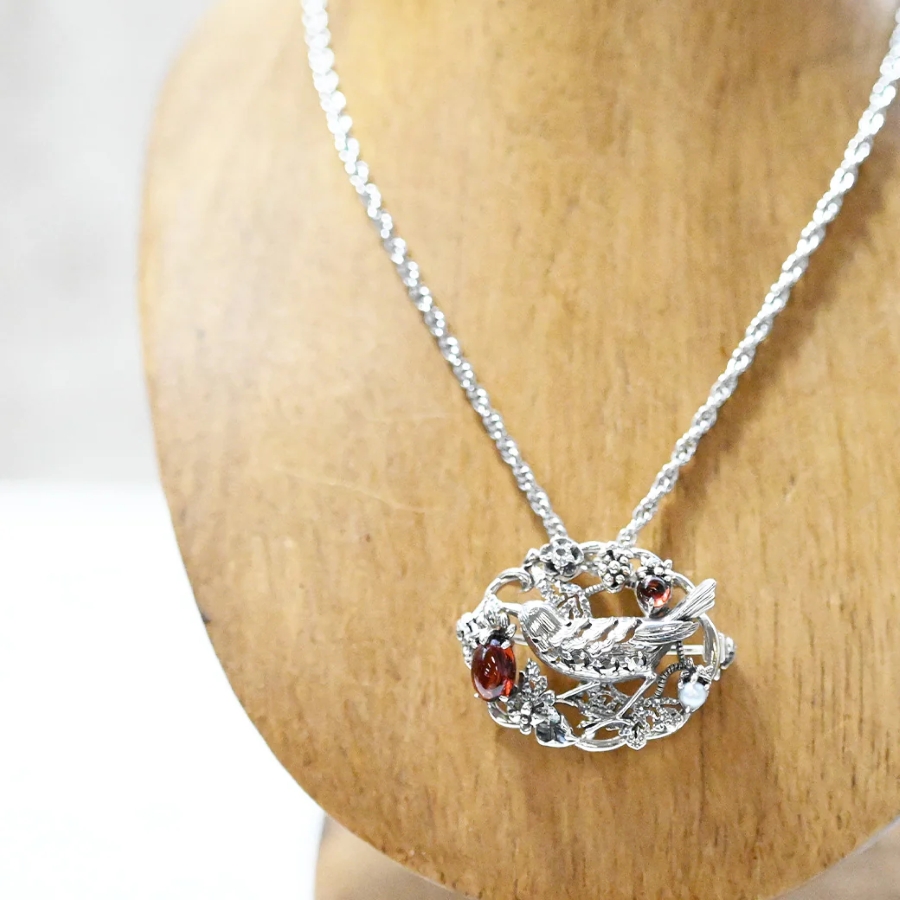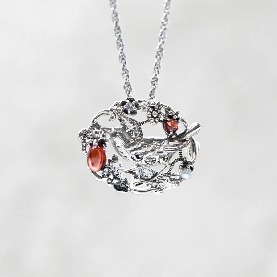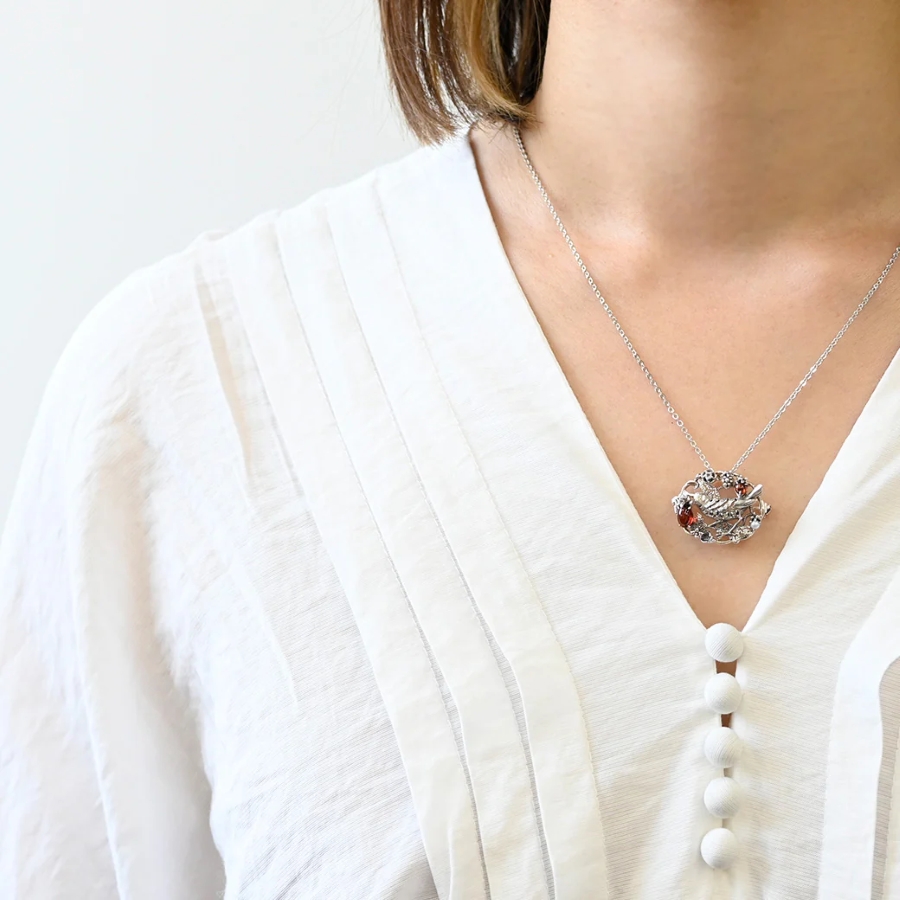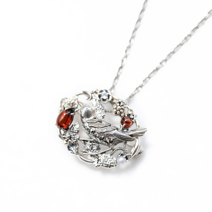 ウィリアム・モリスの代表作「イチゴ泥棒」をモチーフにしたブローチは、可憐な小鳥の姿と艶やかな赤いガーネット、淡水パール、ホワイトトパーズを組み合わせ、繊細な技巧と華やかな輝きを兼ね備えています。