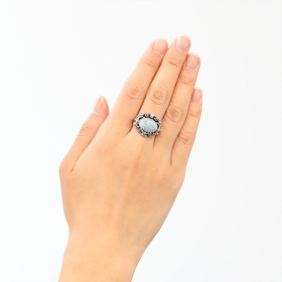 中央には上品なアクアマリンが配され、優しいパステルカラーが一年を通して活躍。