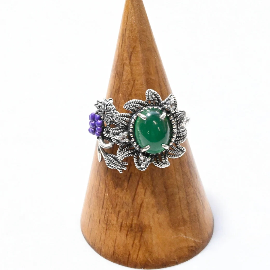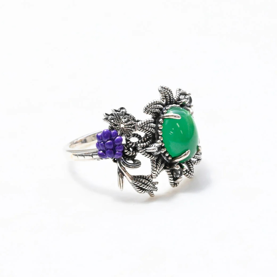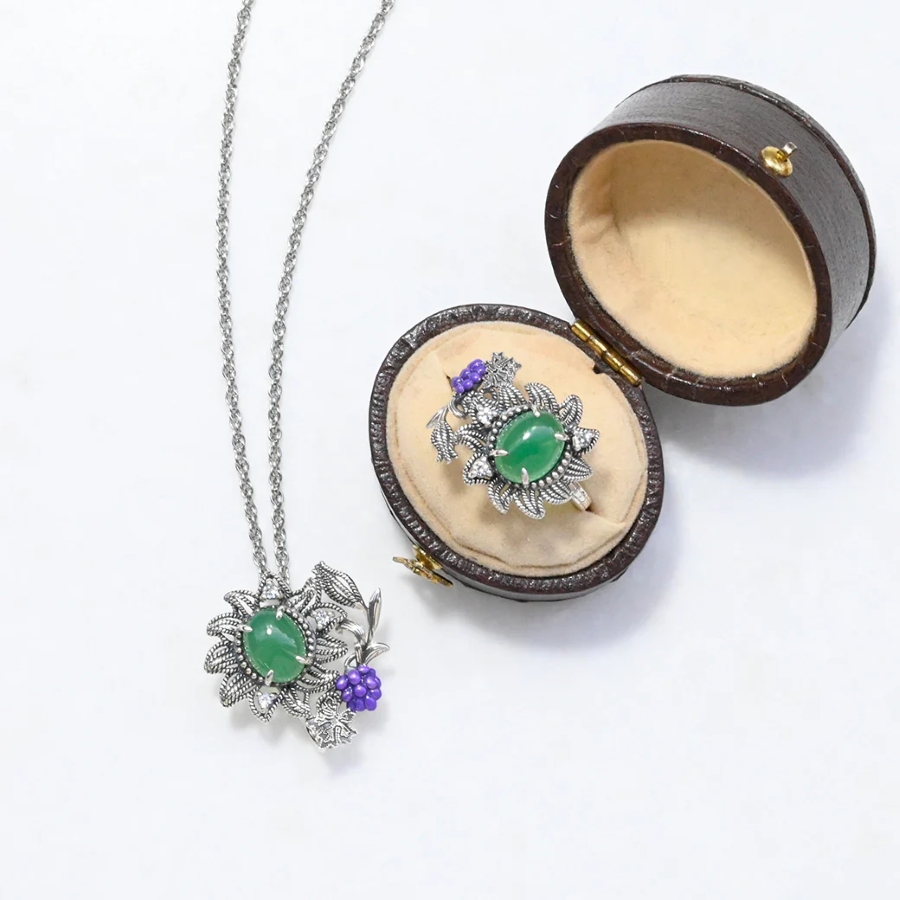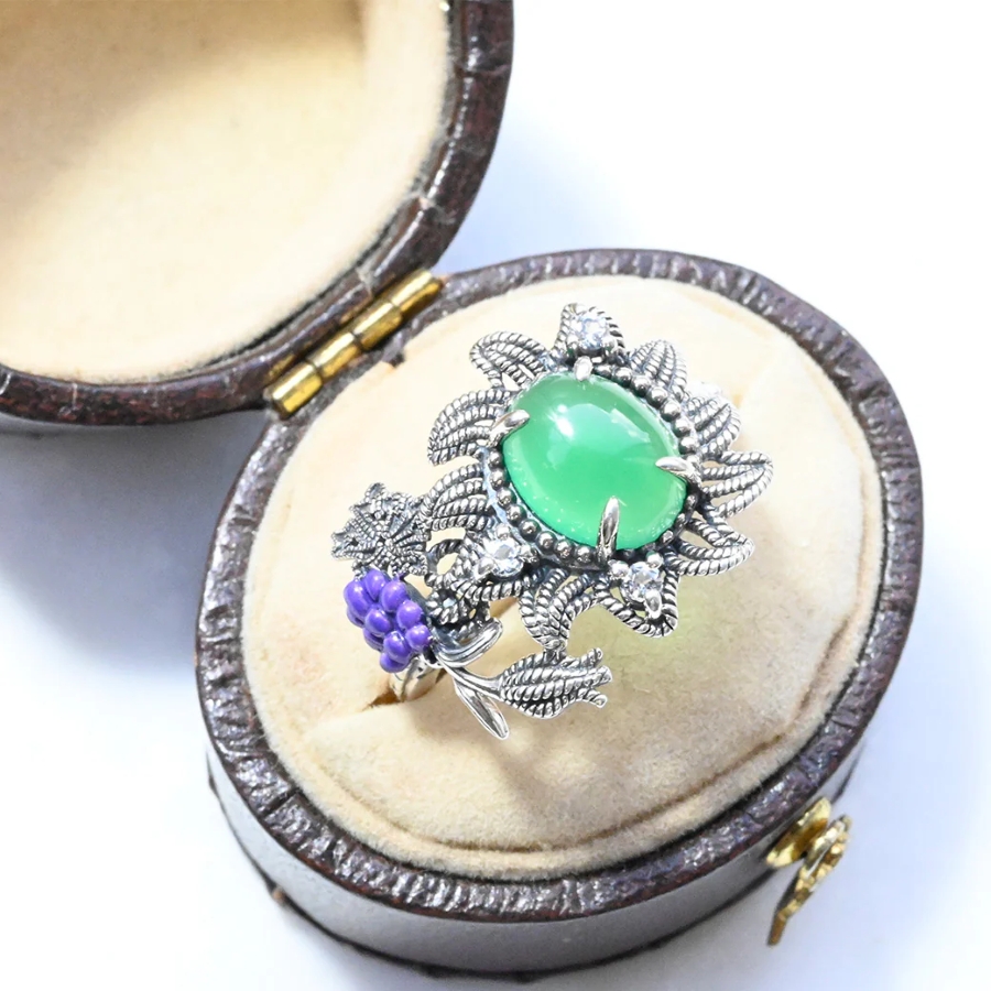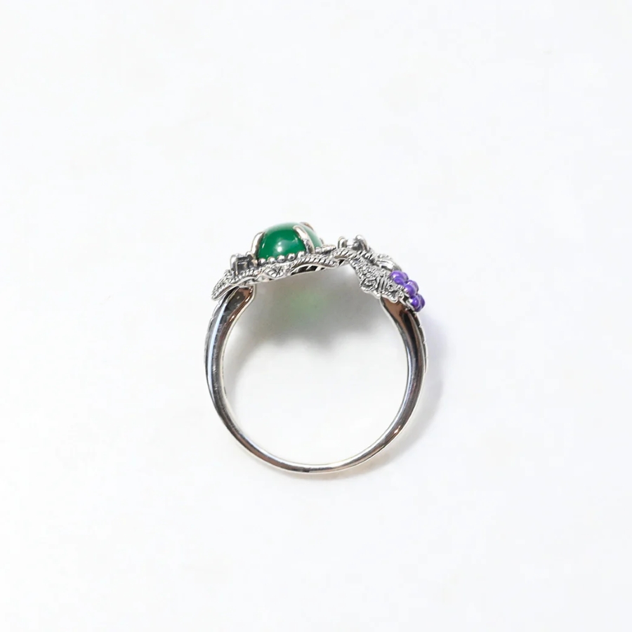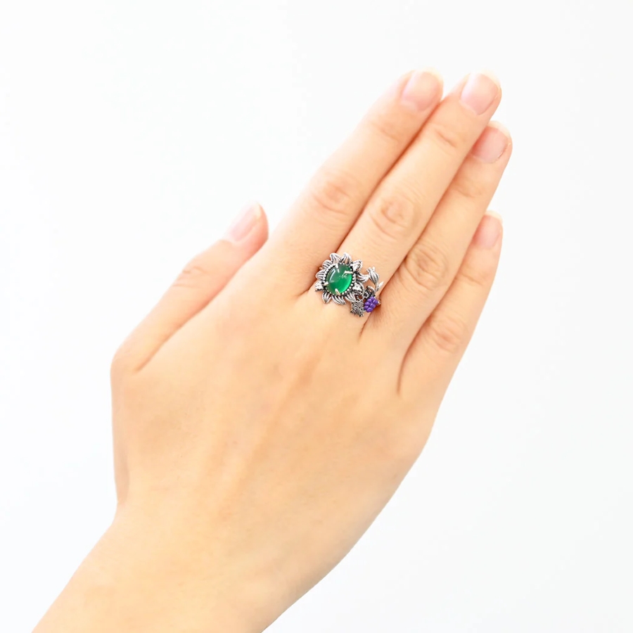 その精神を受け継ぐリングは、落ち着いたグリーンメノウと深い紫色のエナメル葡萄モチーフが寄り添い、色彩の対比が魅力を際立たせます。
