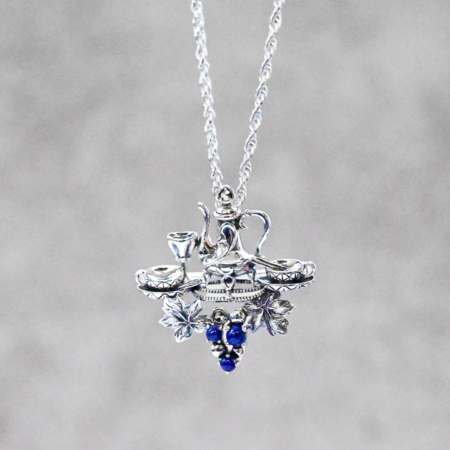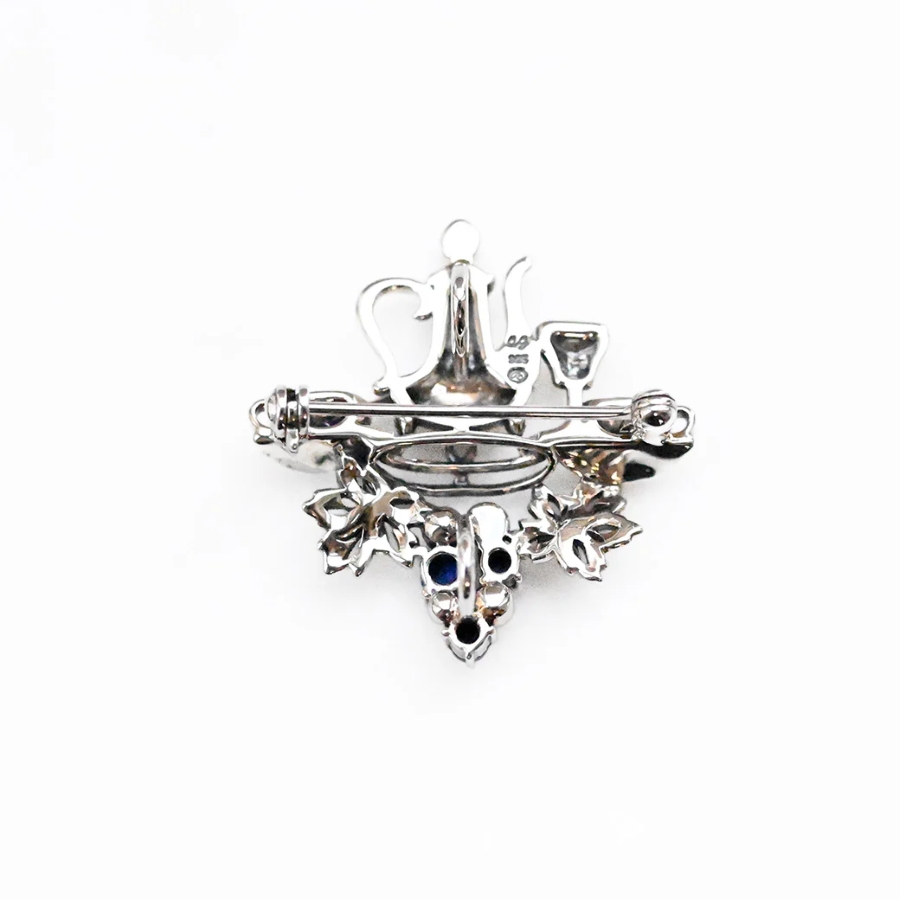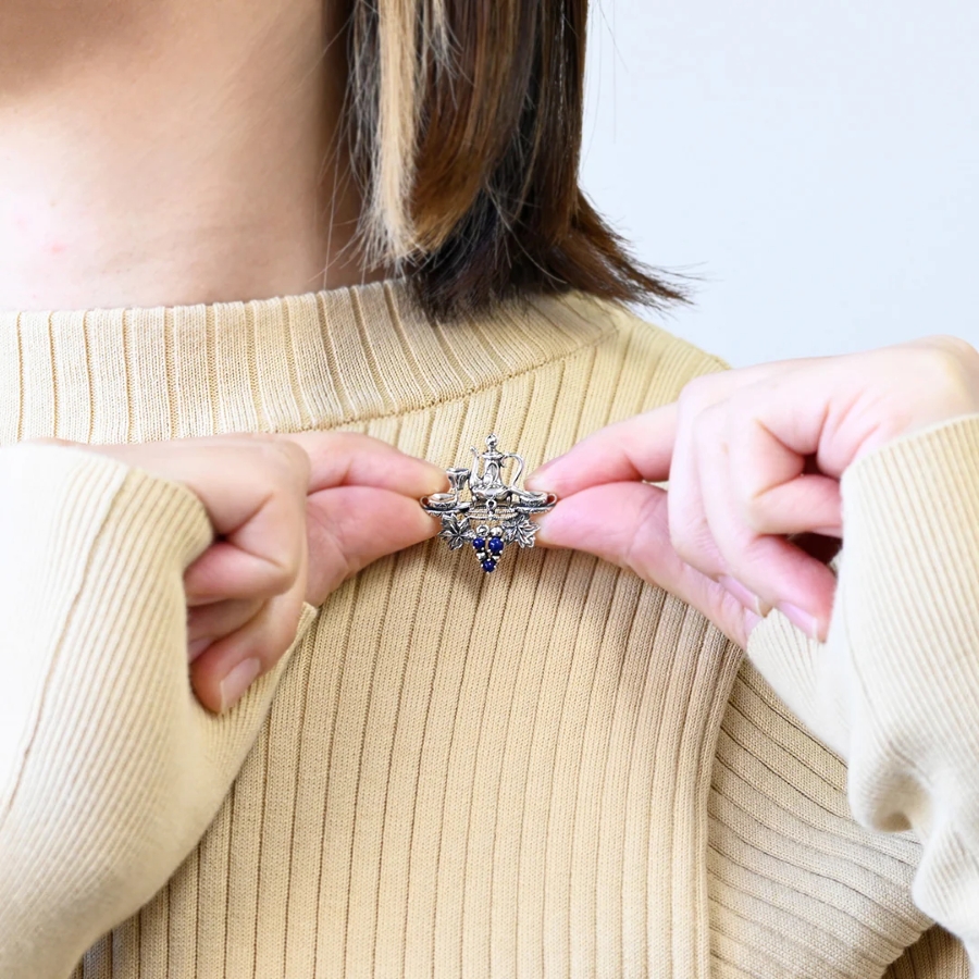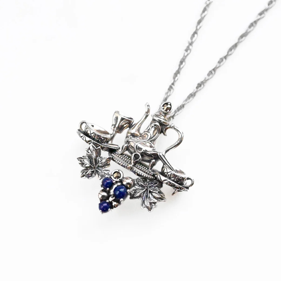 ティーセットや葡萄のモチーフが、19世紀フランスの優雅な午後のひとときを思わせるデザインにロイヤルブルーのラピスラズリを合わせています。