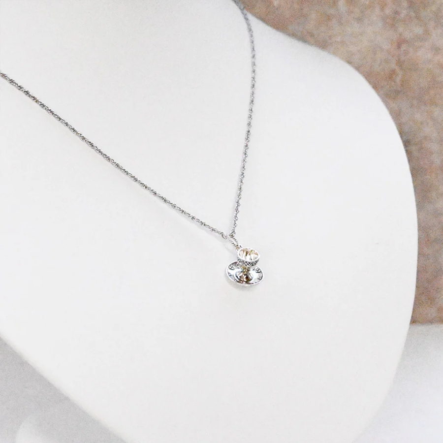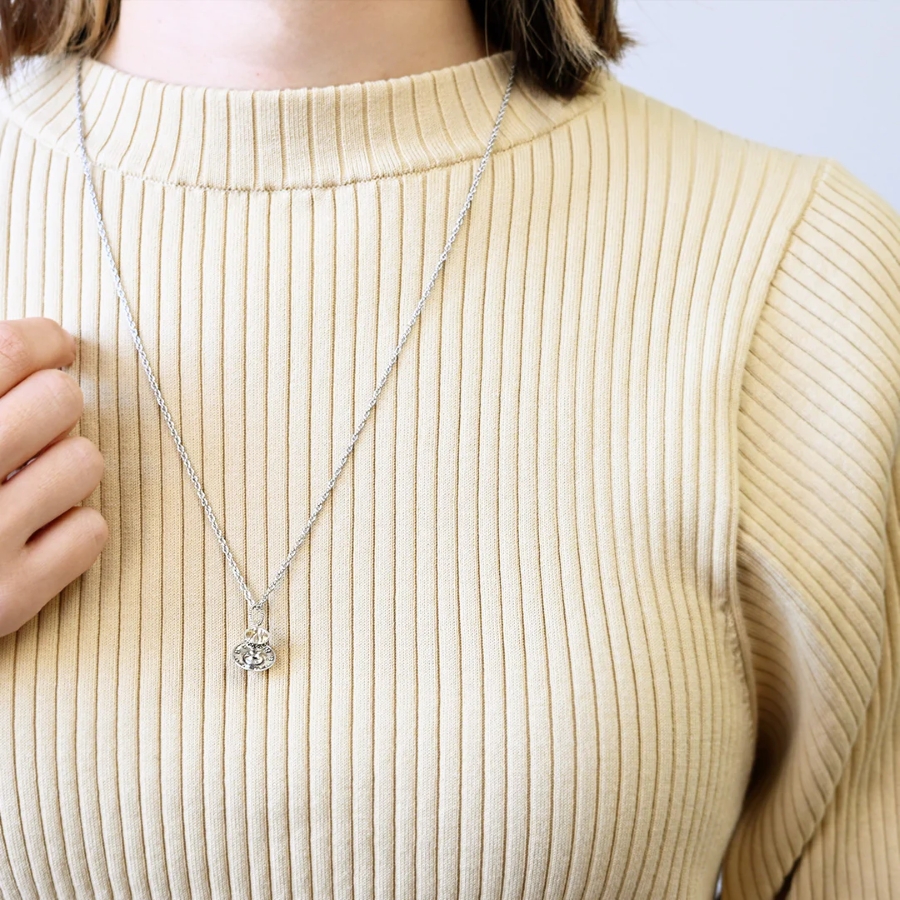 シルバーの繊細な細工が施されたこのデザインは、胸元で優雅に輝き、シンプルな装いにも特別な華やかさをプラスします。