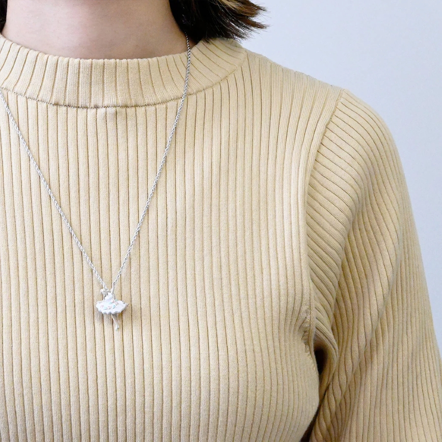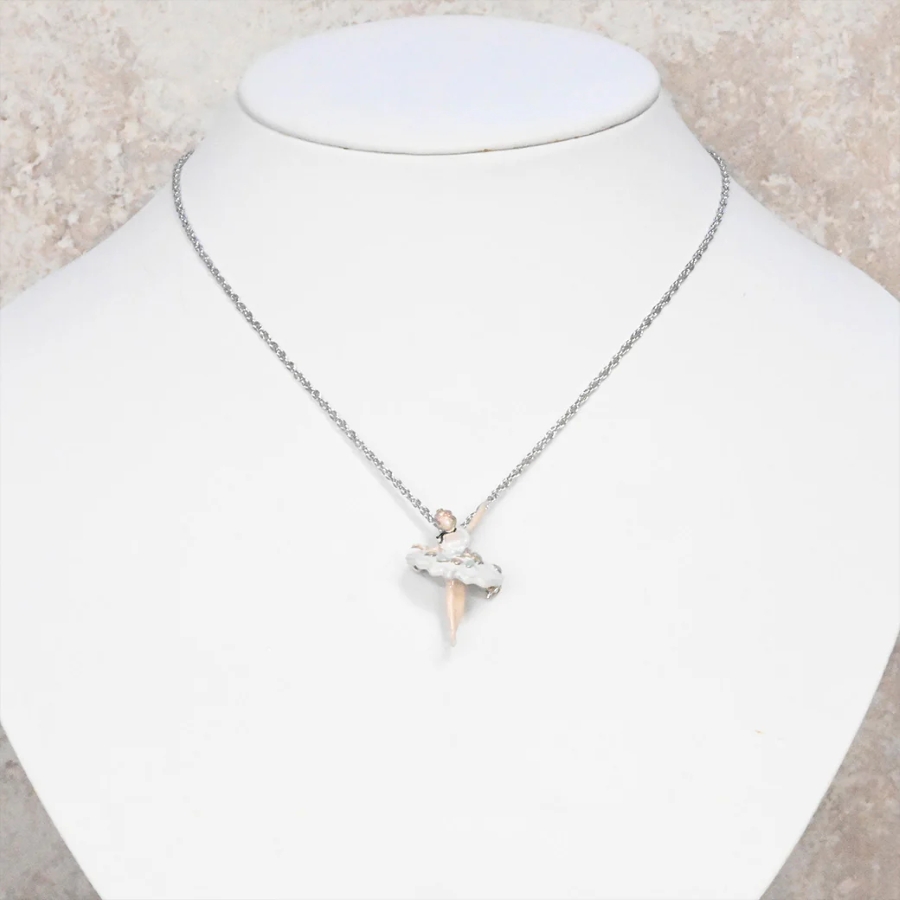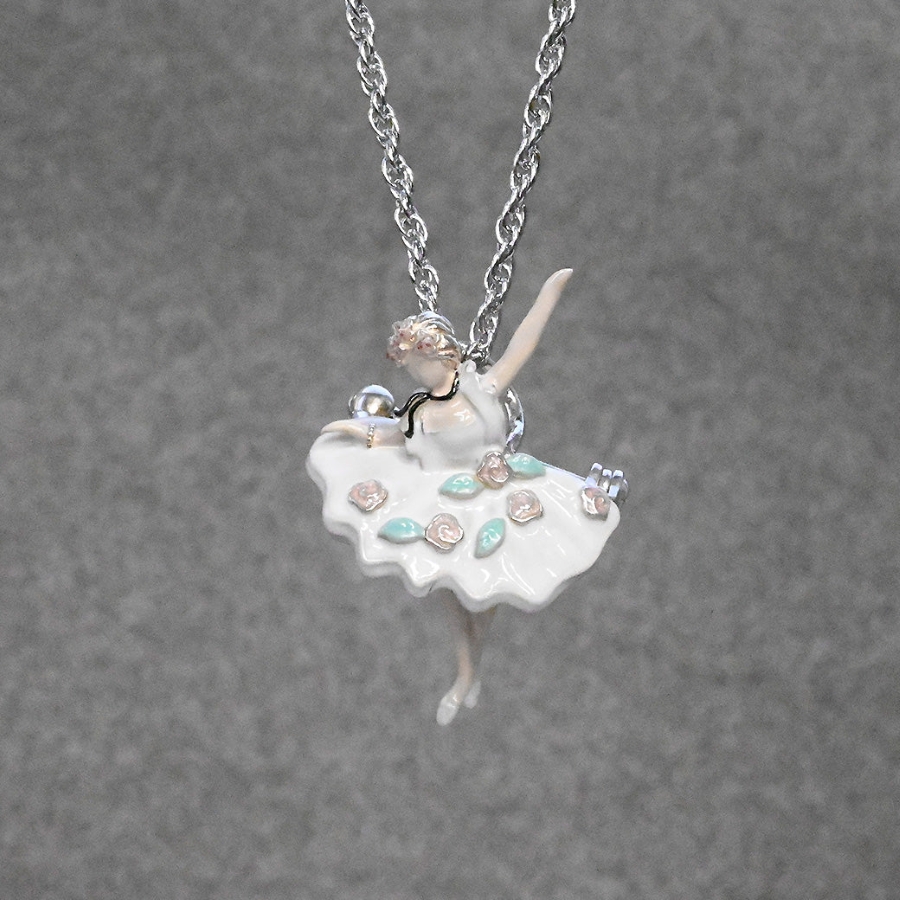 純白のチュチュに小さなバラの花を散りばめた、ロマンティックな踊り子の姿が魅力的。白いドレスとピンクの花の優しい色合いが上品に輝き、シルバー素材がエレガントな雰囲気を添えます。