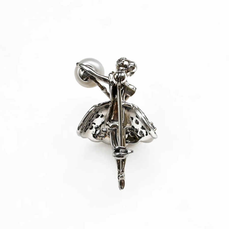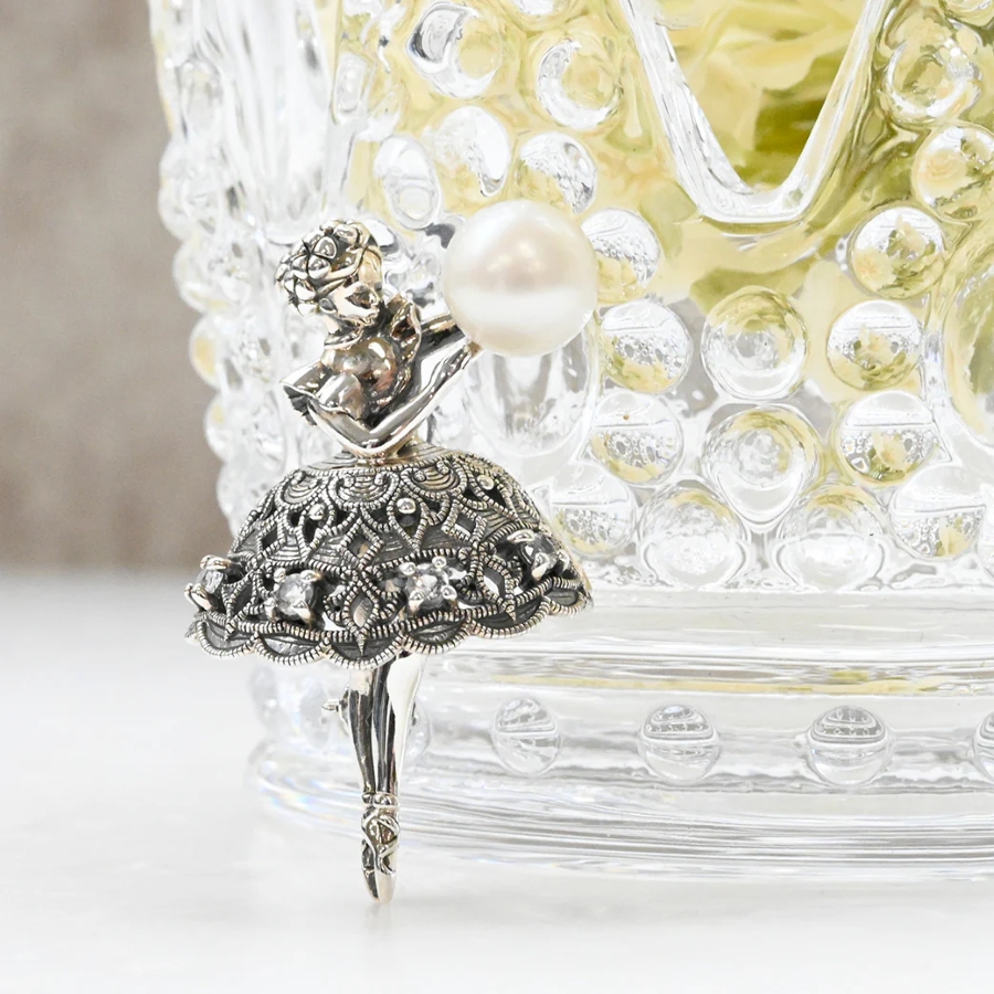 シルバーのいぶし仕上げが深みのある輝きを生み、ホワイトトパーズが上品にきらめきます。バレリーナが手に持つパールが優しく輝き、可憐な中にも大人の女性らしい落ち着いた魅力を添えています。