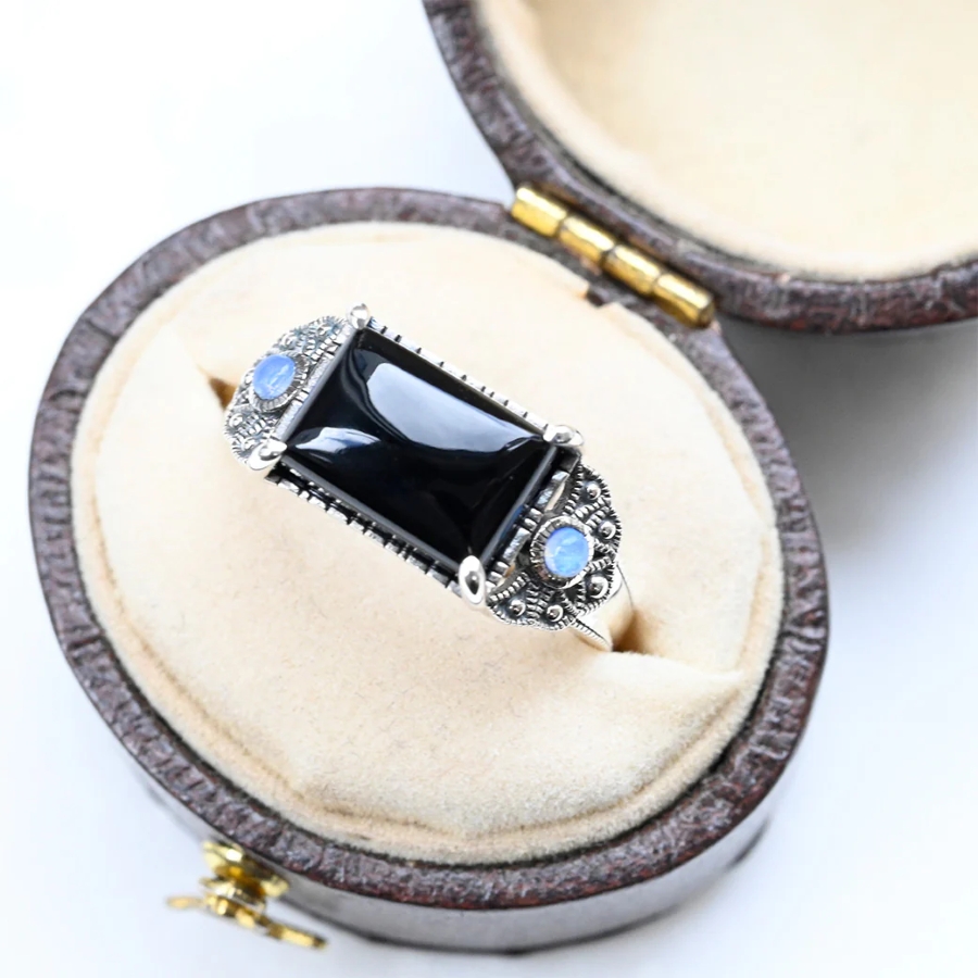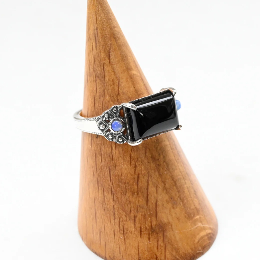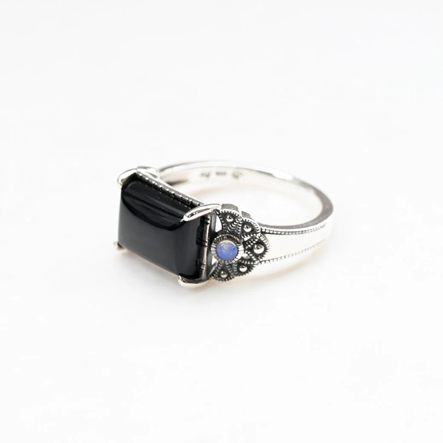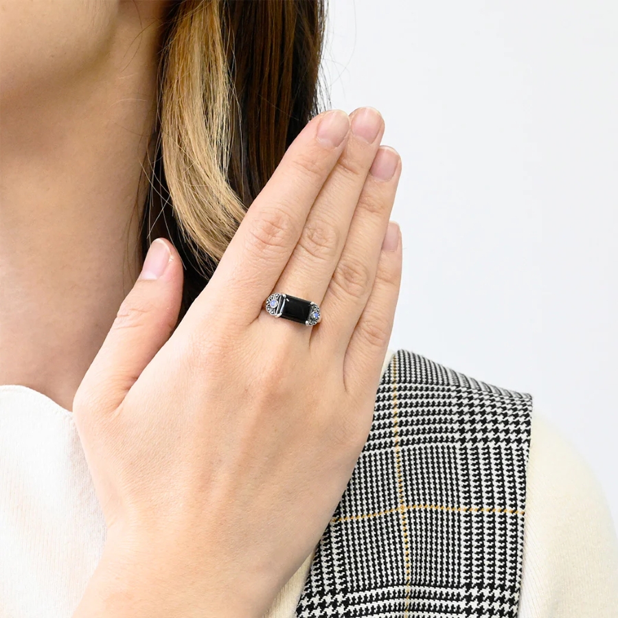 オニキスとオパールが調和するアンティーク調の特別なシルバーリング。