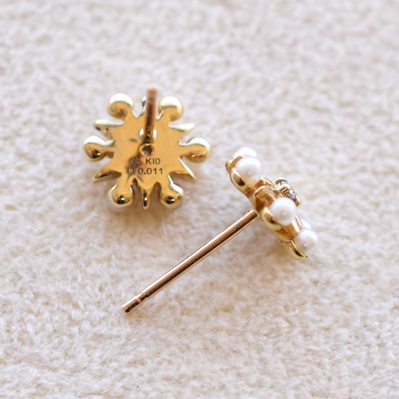 【109E0005-1】K10YG 淡水珍珠&鑽石 小星光 耳釘(淡水パール&ダイヤモンド 星の光 ピアス)