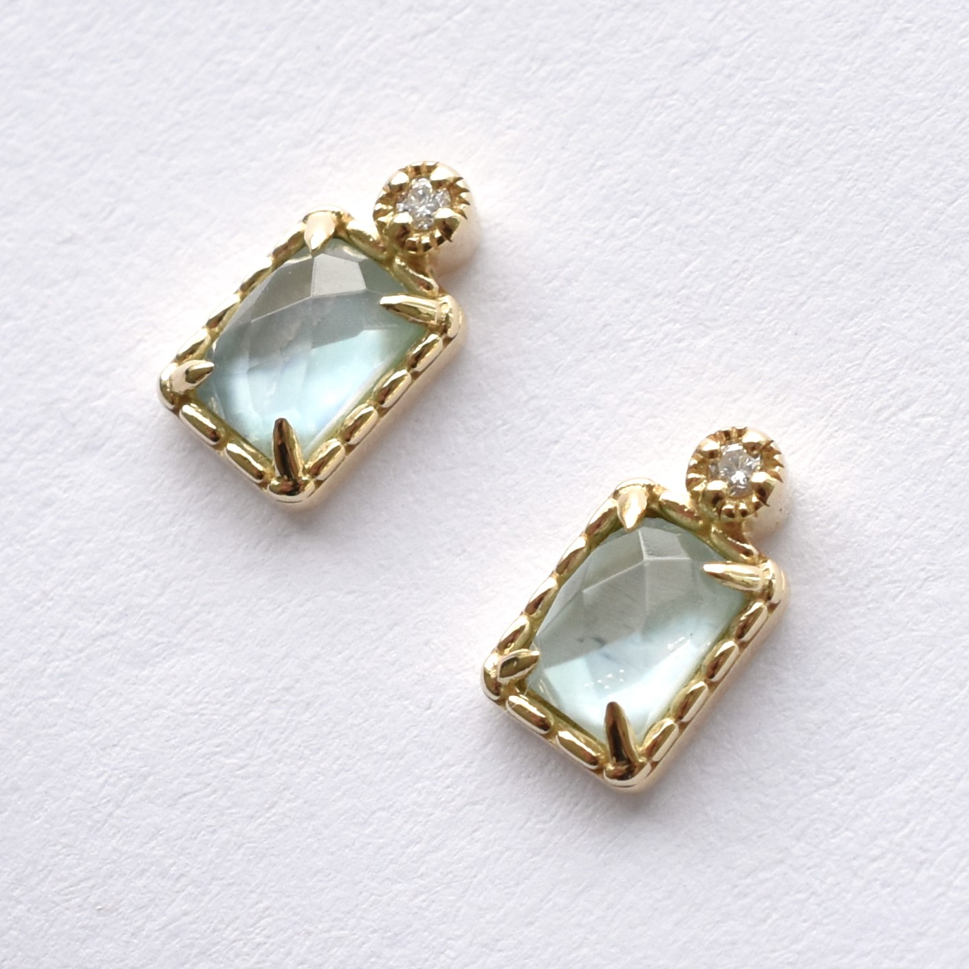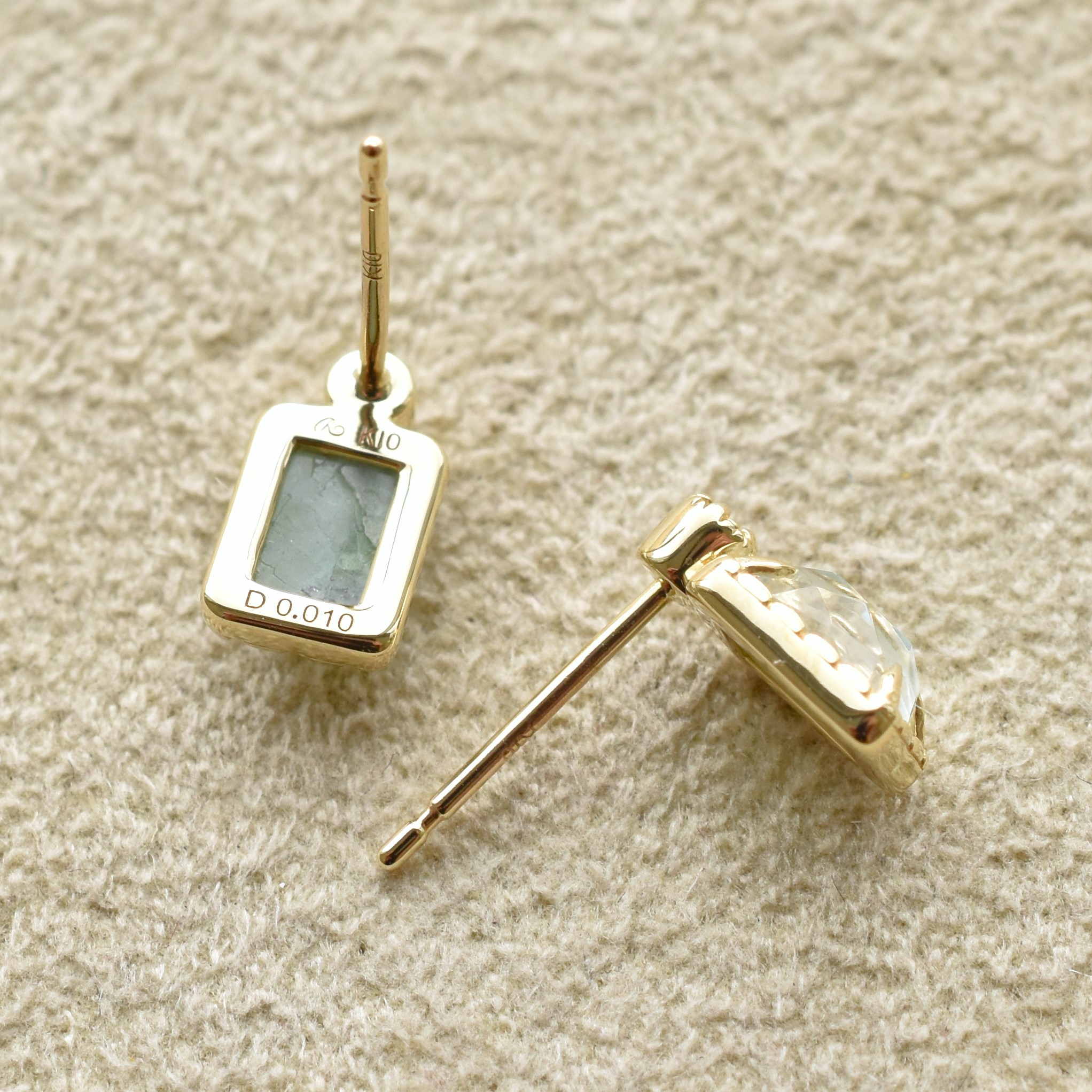 【109E0168-1-TY】K10YG 三層石&鑽石 小綠方 耳釘(トリプレット&ダイヤモンド ピアス)