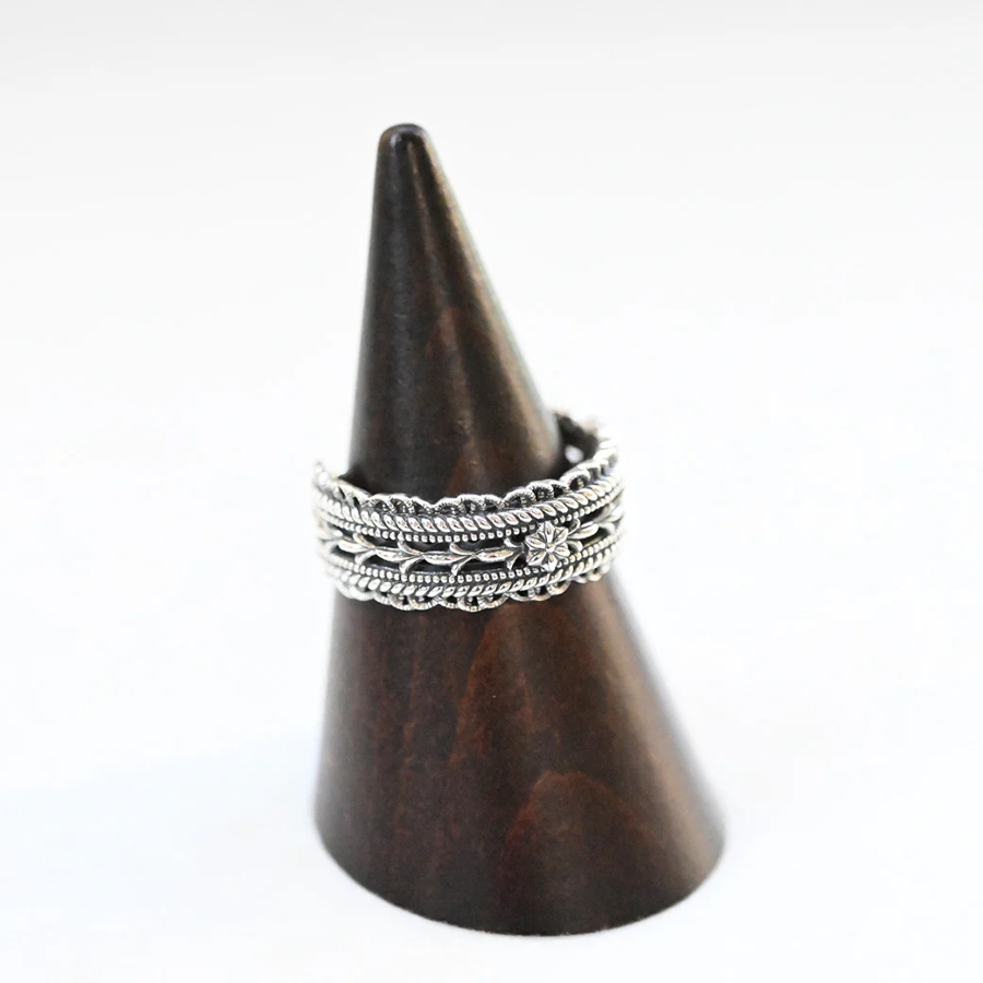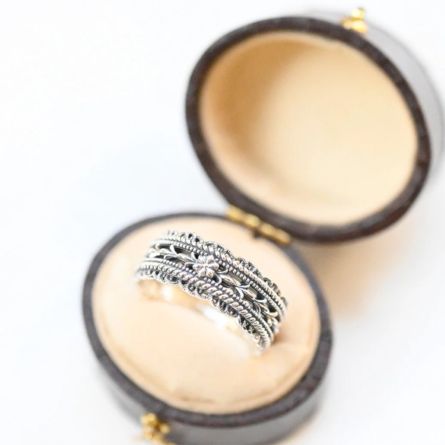 中央には小さな花を思わせるモチーフが控えめに輝き、リング全体に温かみと上質感を与えています。
