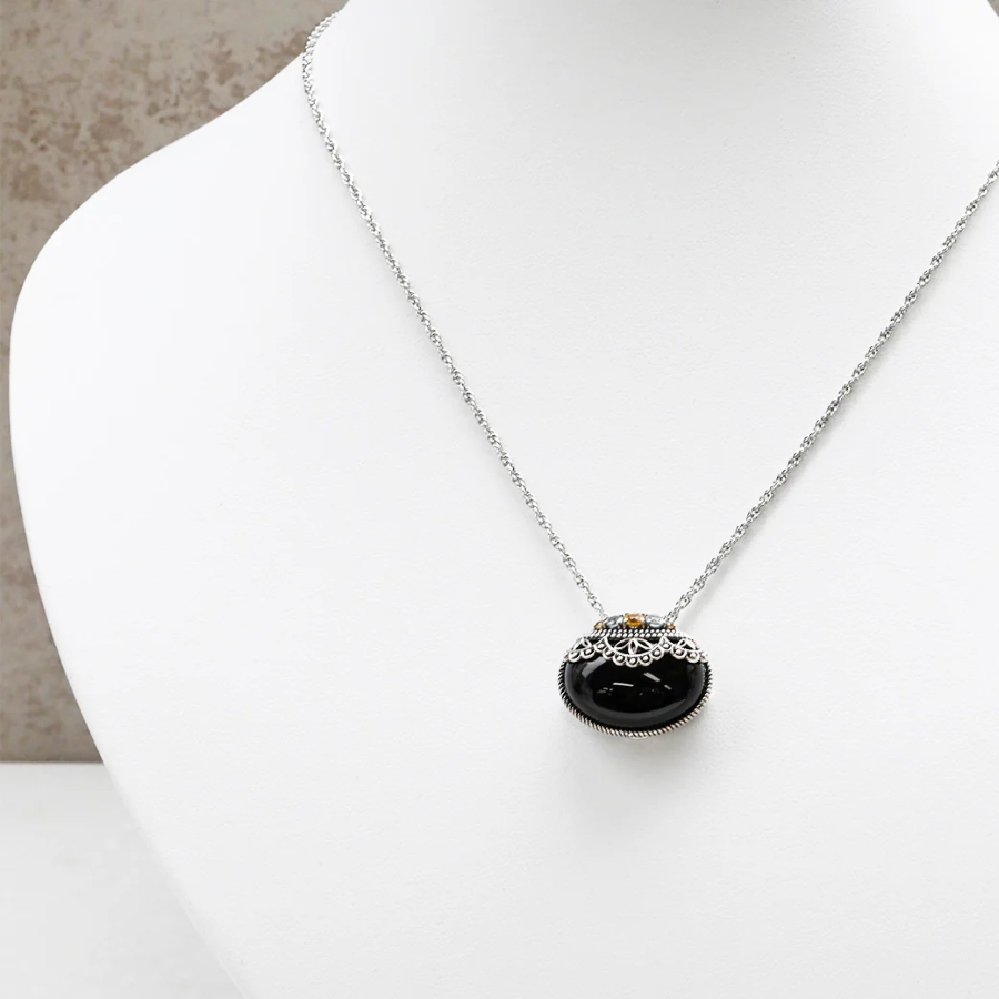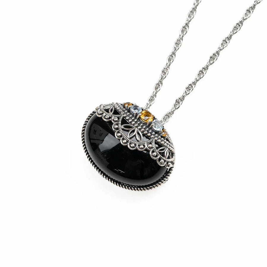 【202C0927-TY】SV オニキス&シトリン レース調イースターエッグ ブローチペンダント