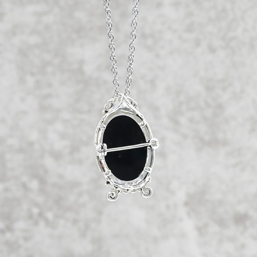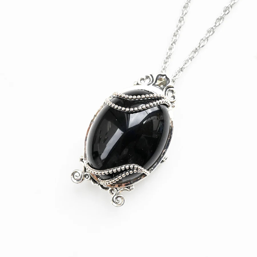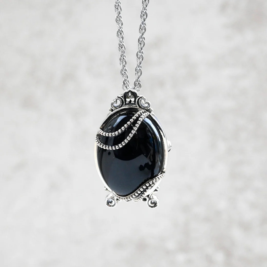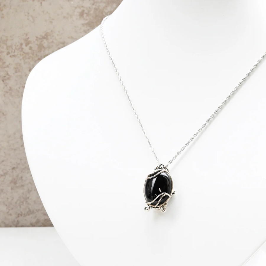 シルバーの繊細な装飾が黒い宝石を包み込むように彩り、曲線美が織りなすアンティーク調のデザインは歴史と芸術性を感じさせる特別な佇まいです。