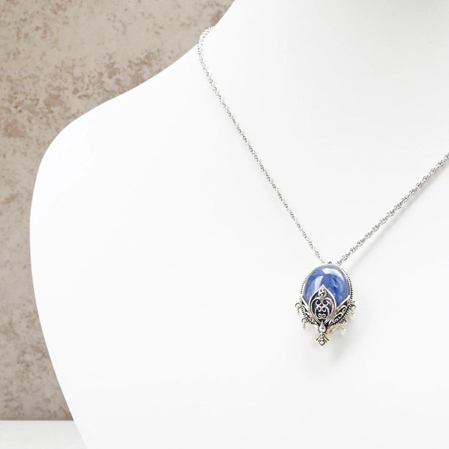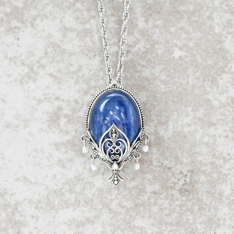 艶やかなカイヤナイトの青色と、揺れるパールの清らかな白が生み出す美しいコントラストが魅力です。夜空を思わせる神秘的な青と、月のような優しい輝きのパールが調和し、上品で洗練された印象を演出します。