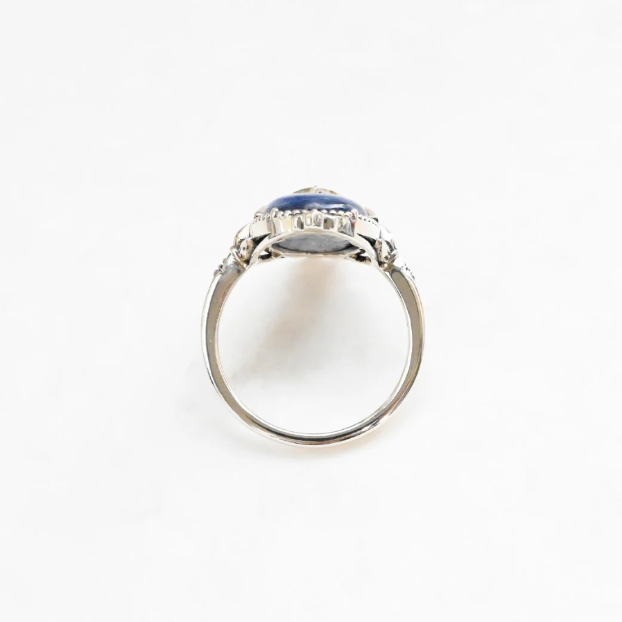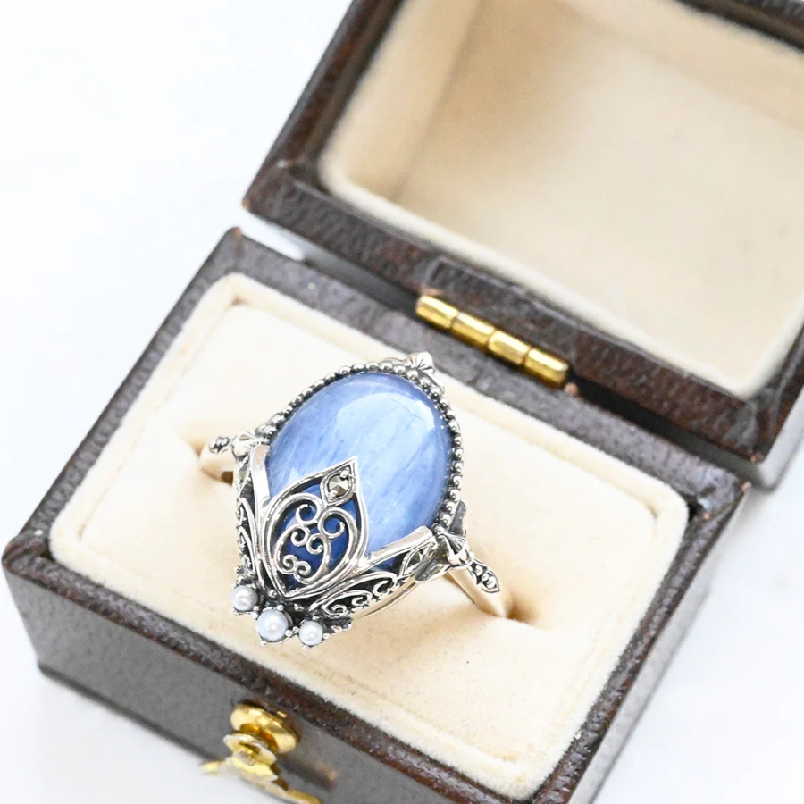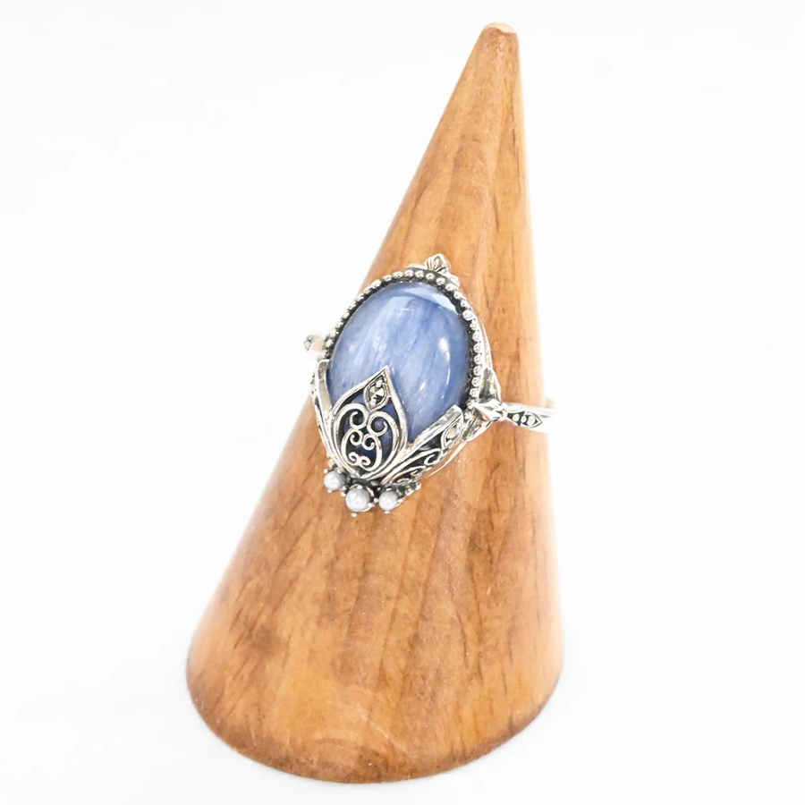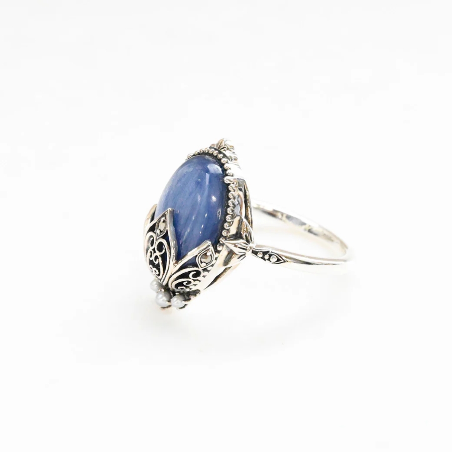 艶やかなカイヤナイトの青色と小ぶりなパールの清らかな白が生み出す美しいコントラストが魅力で、夜空を思わせる神秘的な青と月のような優しい輝きのパールが調和し、高貴な印象を演出します。